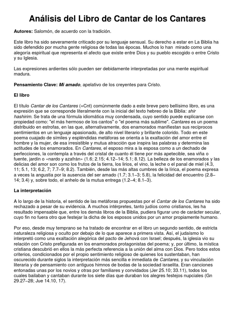 Cantar de cantares resumen. Breve Resumen del libro de cantares referente a Salomn y Sulamita El libro de cantares es un libro potico que toma la forma de un dilogo ntimo de un hombre y una mujer. Porque mejores son tus amores que el vino. Siendo muy figurativo en su lenguaje este libro debe ser interpretado con un piadoso cuidado y sobriedad.