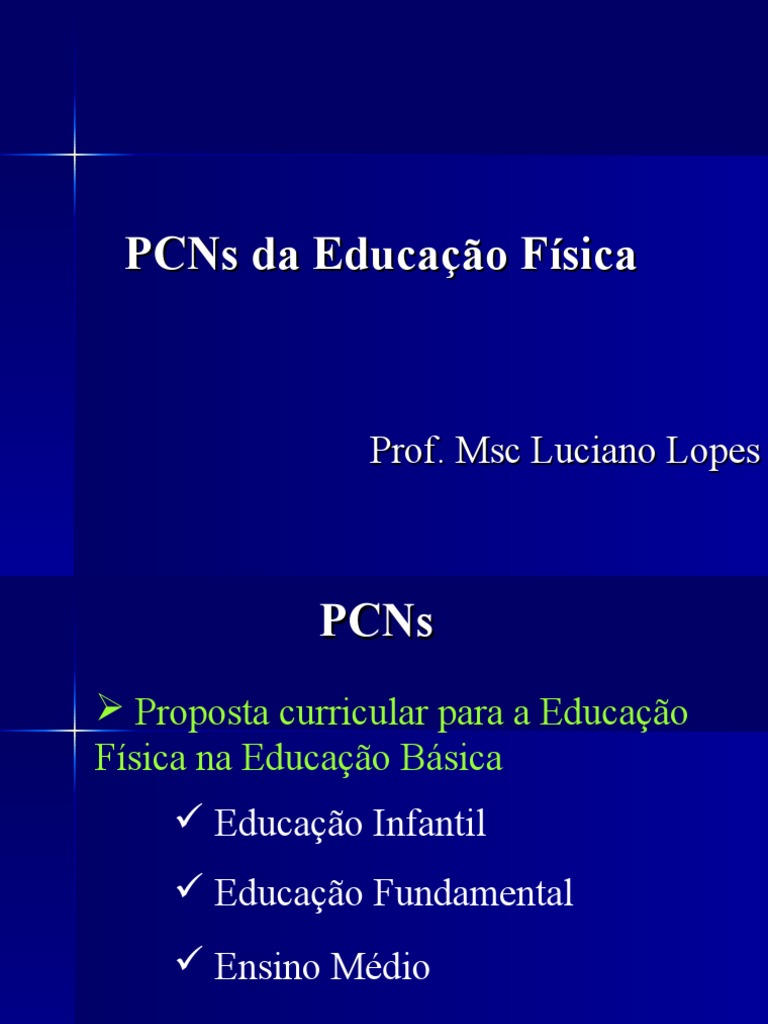 PCNs Proposta curricular para a Educao Fsica na Educao Bsica Educao Infantil Educao Fundamental Ensino Mdio Ensino Fundamental 1 Ciclo 2 Ciclo 3 Ciclo 4 Ciclo. Esse material foi elaborado a fim de servir como ponto de partida para o trabalho docente norteando as atividades realizadas na sala de aula. Os PCNs no constituem uma imposio de contedos a serem ministrados nas escolas mas so propostas nas quais as Secretarias e as unidades escolares podero se basear para elaborar seus prprios planos de.