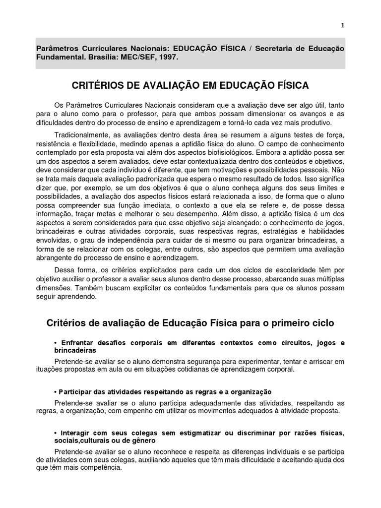 De certa forma a sinalizao efetuada pelos PCN explcita quanto ao queno conduz na direo desejada e vem sendo percebida com clareza pelos professores. Home Page Resenha Do Pcn Da Educao Fisica. Critrios de avaliao em educao fsica Os Parmetros Curriculares Nacionais consideram que a avaliao deve ser algo til tanto para o aluno como para o professor para que ambos possam dimensionar os avanos e as dificuldades dentro do processo de ensino e aprendizagem e torn-lo cada vez mais produtivo.