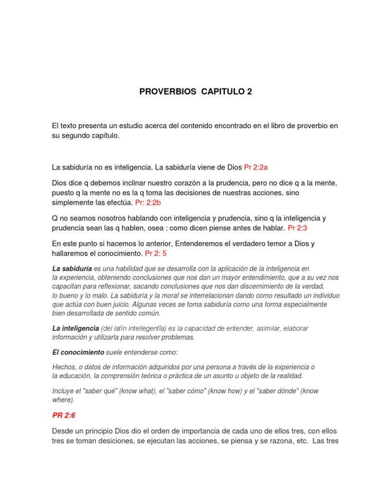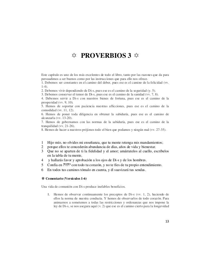 Explicacin y comentario de Proverbios 3. Massi211 Massi211 Los Proverbios de Salomn hijo de David rey e Israel para entender sabidura y doctrina para conocer razones prudentes para recibir el Consejo de prudencia justicia juicio y equidad. La prudencia y la sobriedad que ensea la religin tienden no slo a la salud del alma sino tambin a la salud del cuerpo.