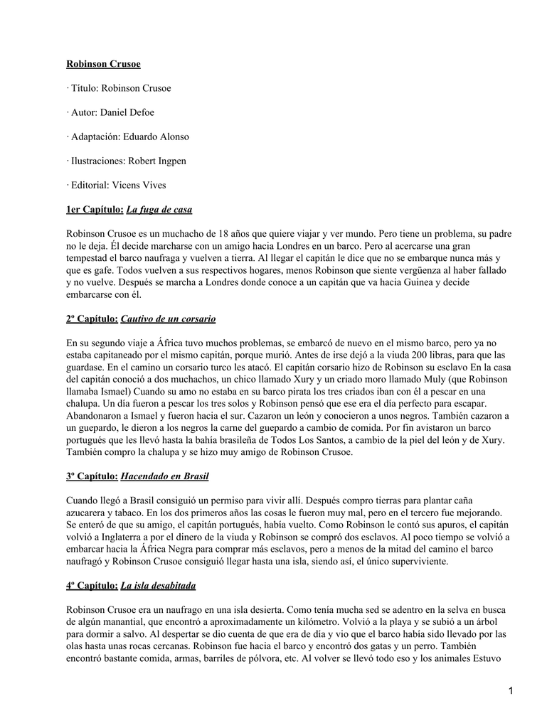 Resumen de robinson crosoe Ttulo. Resumen y sinpsis de Robinson Crusoe de Daniel Defoe. El resumen de Robinson Crusoe puede verse por medio de diversos captulos que comprenden la obra propiamente dicha a continuacin los resmenes capitulados de lo que comprende esta obra en general por lo tanto se tiene.